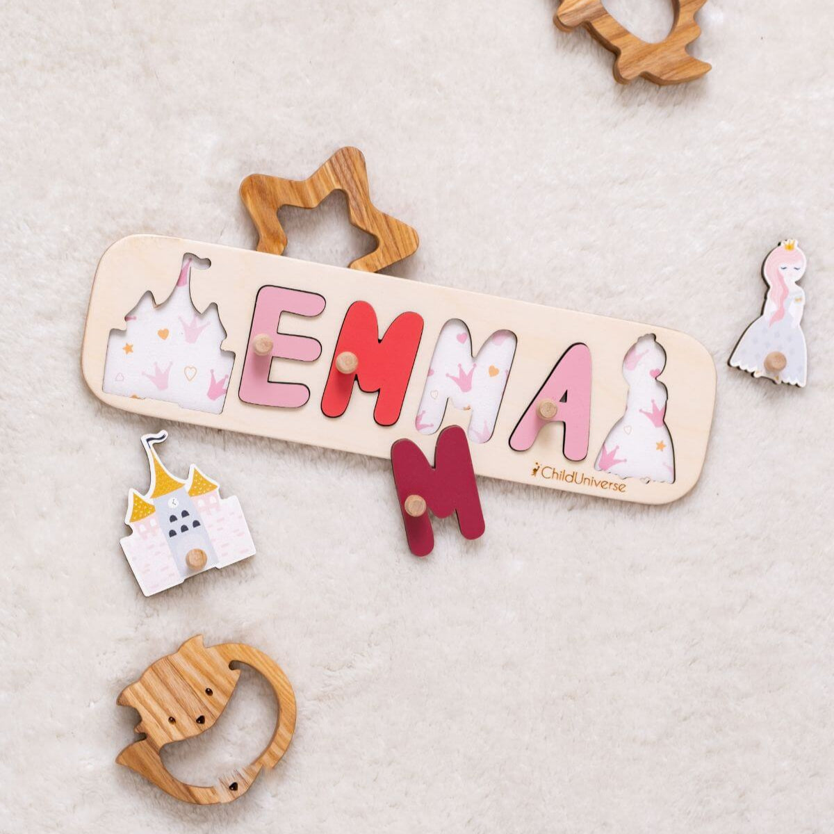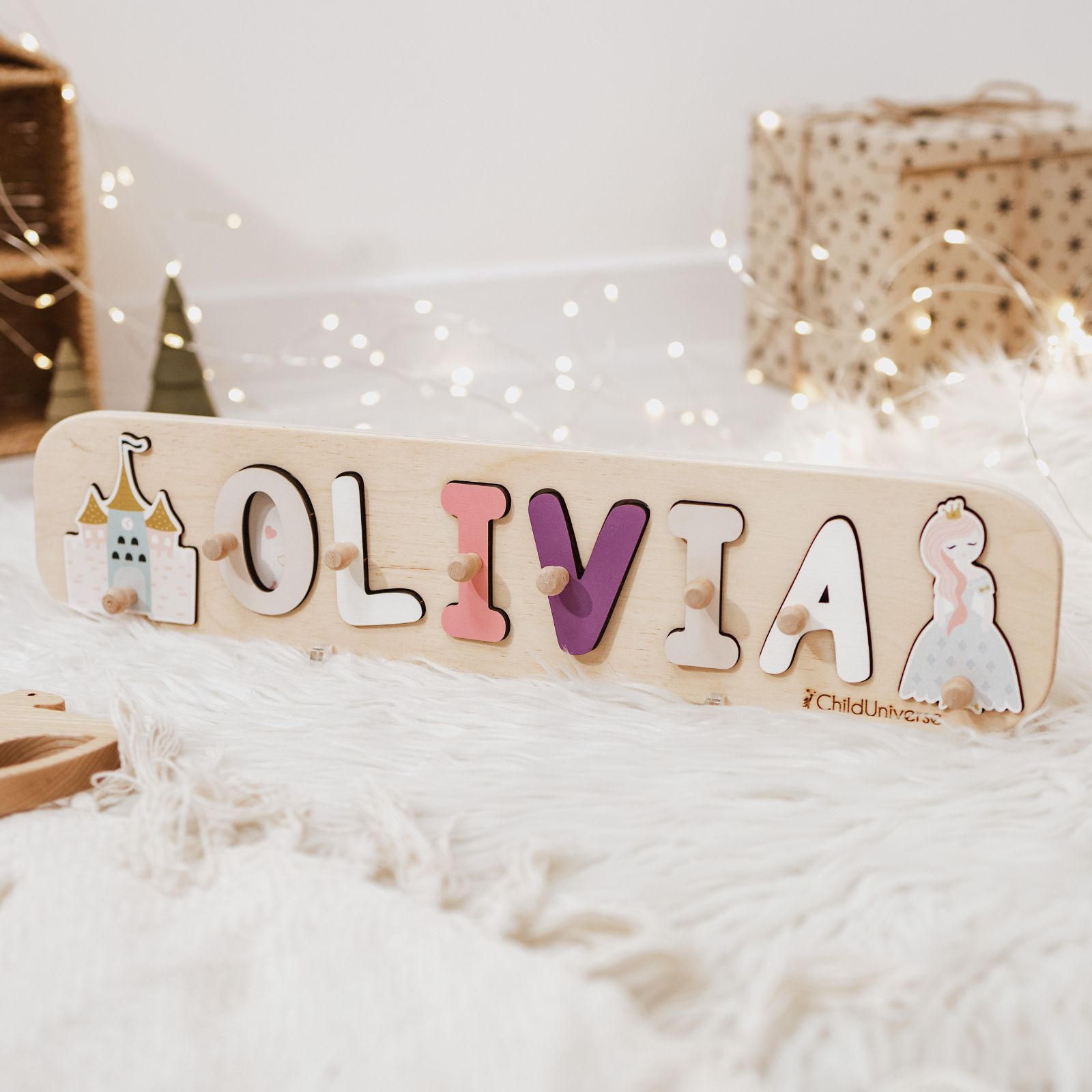 Made of high-quality birch plywood, our princess name puzzle encourages letter, color, and shape recognition, motor skills, logic, and name spelling. To make this fun and educational busy board for baby girl an exclusive gift, order an item with a personalized name. Let the little girl learn her name through practicality and flawless design!