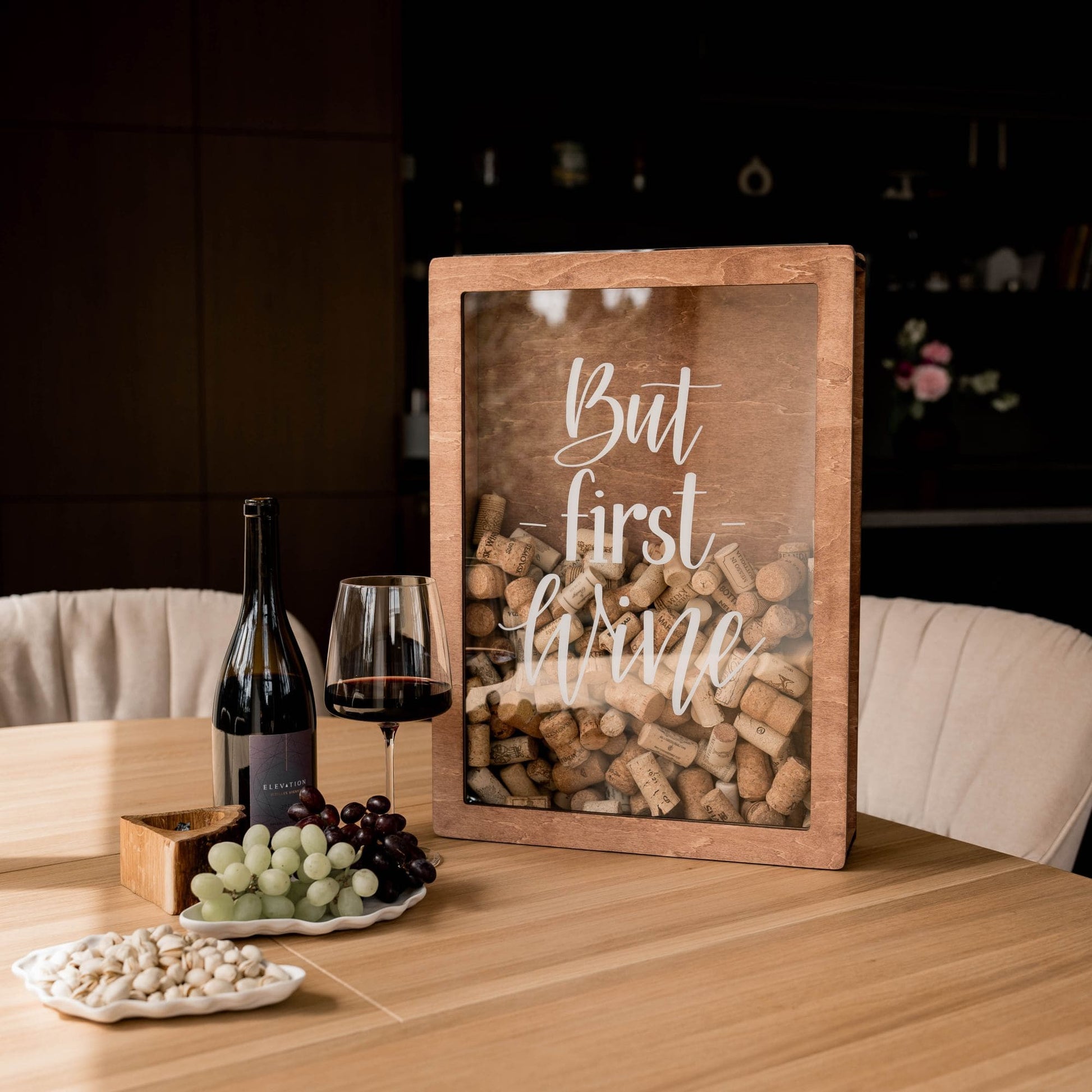 Introducing the Wine Cork Box – But First, Wine from My Wooden Map! This elegant cork collection box is a must-have for anyone who loves to celebrate happy moments and cherish time with friends and family. Embellished with the playful phrase "But First, Wine," it’s perfect for collecting corks from your most memorable occasions.